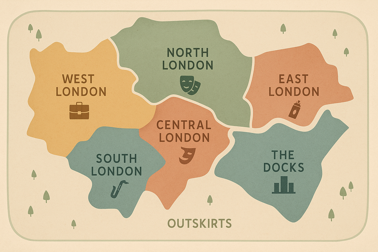 London ist riesig. Wer hier lebt, weiß: Jede Ecke hat ihren eigenen Rhythmus, ihren eigenen Ton. Statt alle fünfzig Stadtteile einzeln aufzuzählen, haben wir sie zu größeren, erzählerisch sinnvollen Zonen zusammengefasst. So findet jeder Charakter ein Zuhause, das zu seiner Geschichte passt – ob Künstler, Studentin, Polizist oder Theaterdirektor.